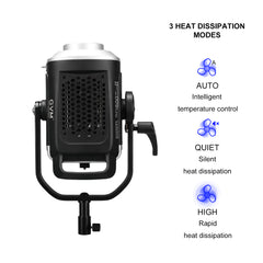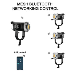 Not only can it be controlled through a controller, remotely adjusted via APP Bluetooth, and controlled by MESH networking for multiple lamps; it also supports the studio standard DMX interface, which can achieve low-precision 8-bit and high-precision 16-bit DMX control modes.